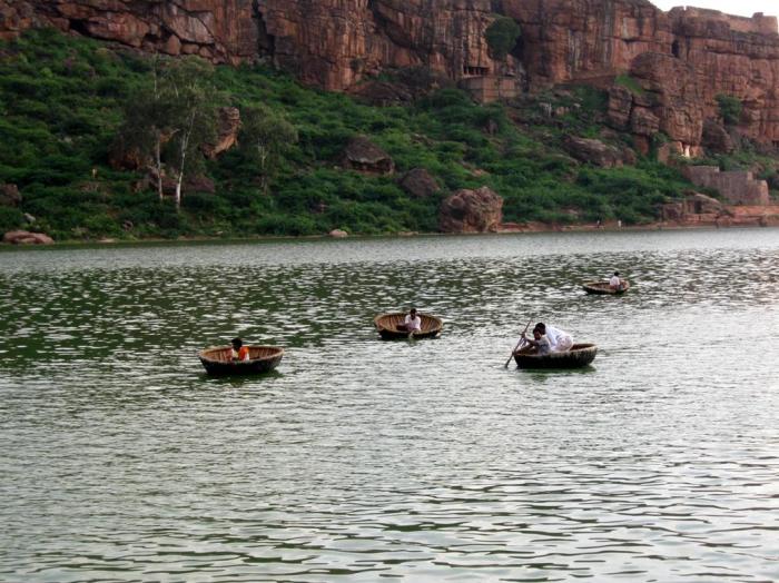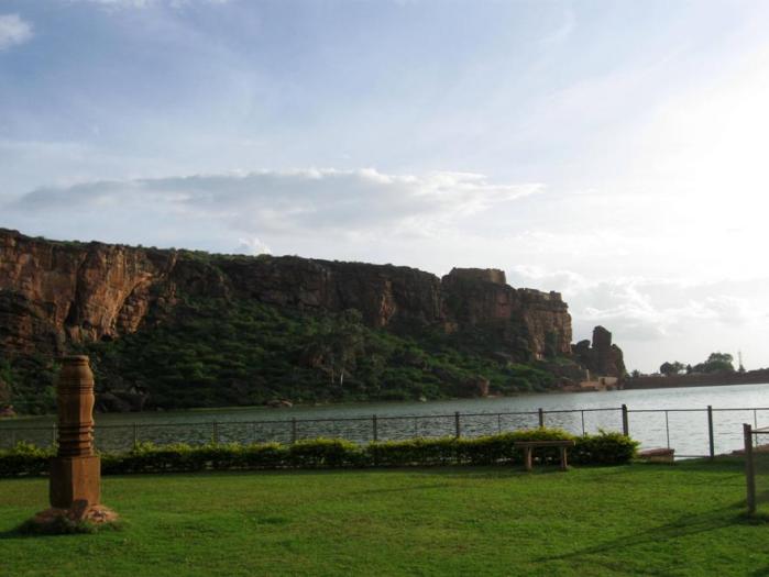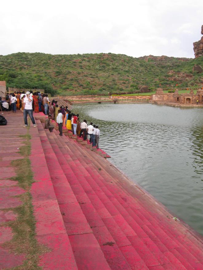 The Badami Cave Temples are across the lake. On the right is the western bank of the Agastya Teertha
