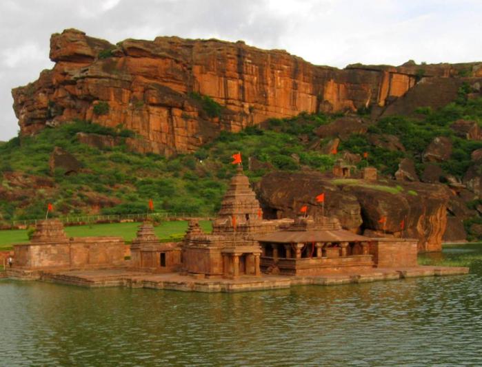 The Bhootnatha Temples are dedicated to Lord Shiva—Shiva in the form of the God of souls, spirits and ghosts. Built out of red sandstone probably sourced from the surrounding hills, the two temples are placed opposite one another at the eastern and western banks of the Agastya Teertha. The approach to the Agastya Teertha and the Bhootnatha Temples from Badami Caves is via a narrow and winding path that passes through a village.