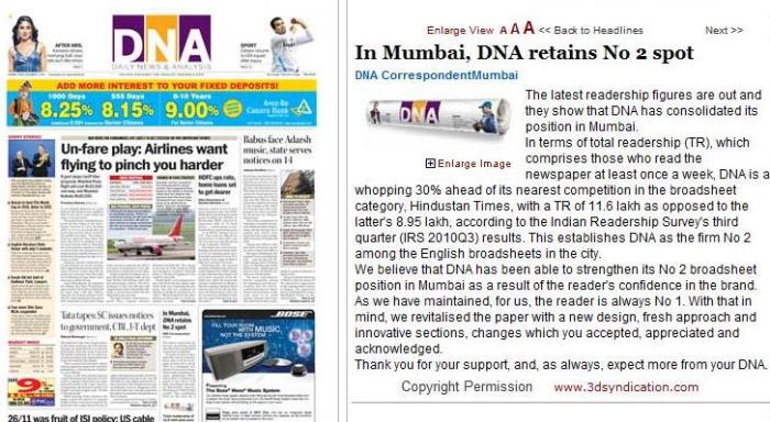 It fights for the No.2 position as illustrated by articles in today’s newspapers of both the DNA and Hindustan Times. Using data from the 2010 Indian Readership Survey (IRS), both broadsheets have claimed that they are the No.2 broadsheet in Mumbai.