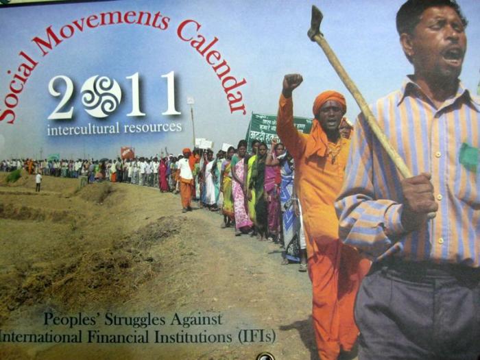 The Social Movements Calendar (SMC) 2011 is a themed calendar on “peoples’ struggles against international financial institutions(IFIs)”. Right from the cover (see photo above), which is a rally of protesters against land acquisition for mining in Jharkhand to the list of resources on this topic, each page of the calendar reflects the theme.