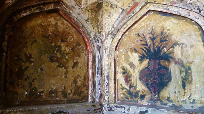 Badly damaged frescoes on the walls leading to the burial chamber in Akbar’s Mausoleum