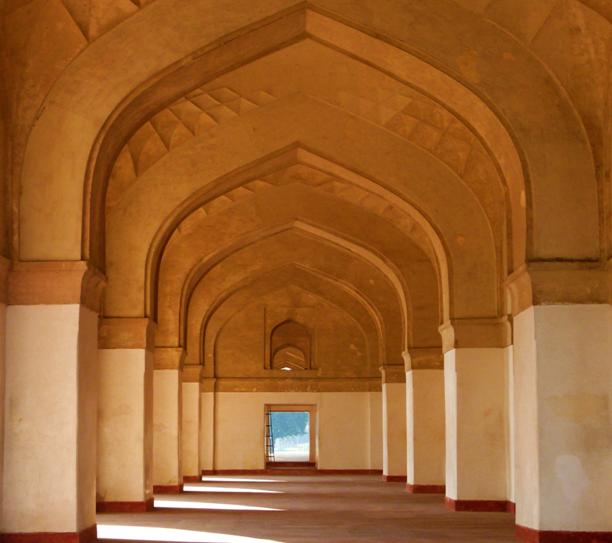 After a visit to Akbar’s burial chamber, and with the prayer still echoing, I take a walk around the premises. There are hardly any tourists and the wide, arched passageways that run on all four sides of the Mausoleum are empty and peaceful. Some of the arches are covered with screens; some of them are not leading to sunlight creating some beautiful patterns and light and shadow effects on the floors and walls. I spend quite some time delighting in this play of light.