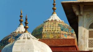 The domes of the Mausoleum appear in their pristine, marble white today, but were once painted in brilliant hues. Today, this can be seen on only one or two domes (see photograph on the left).