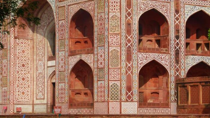 The sounds of traffic fade away as I approach the entrance to the Mausoleum, which is a tall red sandstone gateway, nearly 70 feet high, and topped by four marble minarets. From a distance, the walls appear poly chromatic and it’s only when I am close enough that I realise that the effect is due to inlay work in white marble, yellow limestone and greenish black slate on the red sandstone structure, creating intricate geometrical and floral patterns on the walls. Delicate calligraphy in white marble stands in relief in the midst of all this inlay work.