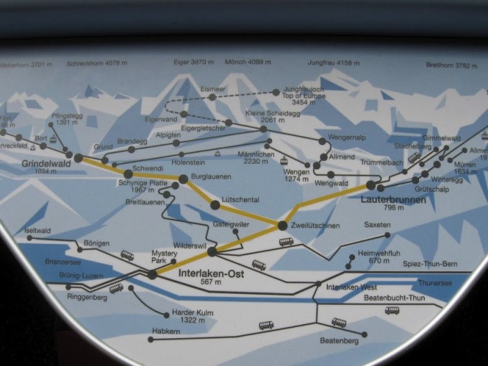 This is the diamond-shaped route we will taking to Kleine Schedigg from Interlaken and back. We ascend via Lauterbrunen and return via Grindelwald.