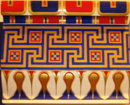 Till mid-19th century, experts thought that Greek Temples were white. It was quite a shock for them to discover that they were actually covered with incredibly bright colors — while the columns were striped red and blue, the Ionic capitals sported gold colour as well. (pg. 126-127) See the picture on the right : the British Museum in London has a reproduction of this colour scheme and I had taken this picture on one of my visits there after I had gotten over my own shock at the discovery that the Parthenon could have been so brightly coloured.