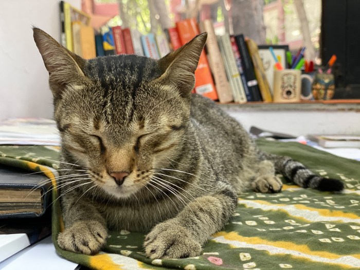 This time it was louder and when I looked up it was to see a cat standing on a chair and peering over the table at me with the most curious expression.