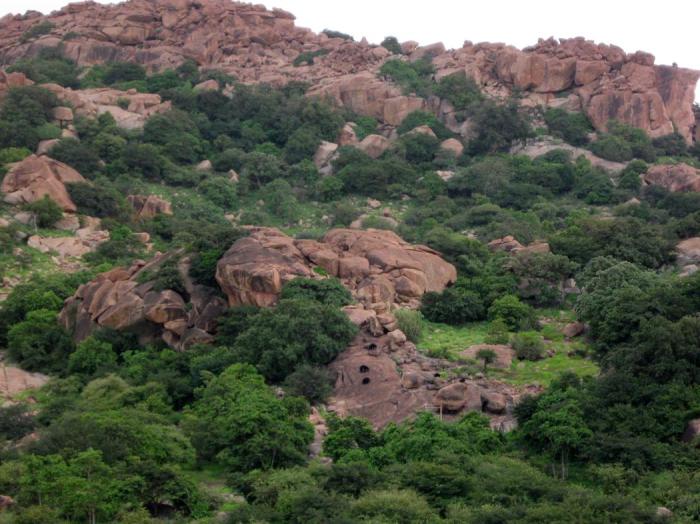 Our tour group had just driven to the Daroji Sloth Bear Sanctuary from Hampi (about 15 km) over some rather bad roads, through beautiful scenery, and imminent rain. We were at the Sanctuary to see the Indian sloth bear or karadis, who came out of their caves every evening to have a special paste of rice and honey (or was it jaggery?) that was smeared on the rocks near their caves by the Sanctuary guards. For me karadi brought forth images of Baloo, the Jungle Book bear, resplendent in his Disney avatar or Jambavan, the wise bear king from the Ramayana. I was rather keen on what the karadi really looked like!