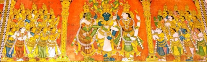 Almost on cue, the doors open and the curtain inside parts and I see Her — Meenakshi Amman of Madurai. With the illumination provided by numerous oil lamps, I can see that she is wearing a green saree, much like the one in the Tanjore painting I have at home (left). The jewellery she is adorned with sparkles and twinkled in the light.