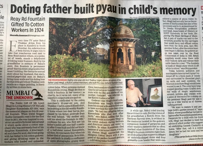 This mention in The Times of India, published on October 19, 2014, is perhaps the most special for it is about a water fountain I wrote about on the blog and built a fictional history around it. A few years I found that most of it was true, and this article talks about it.